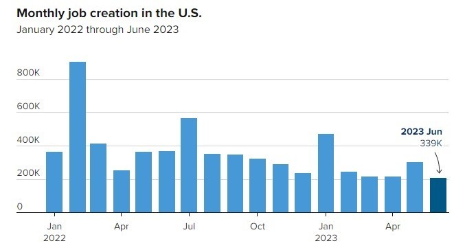 Η επίδοση του Ιουνίου, αν και παραμένει υψηλή, σηματοδοτεί μια μεγάλη κάμψη σε σχέση με τα στοιχεία του Μαΐου, όταν είχαν δημιουργηθεί 306.000 θέσεις εργασίας.