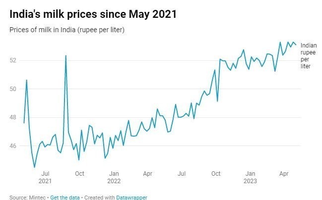 Σύμφωνα με στοιχεία που παρέχονται από τη βάση δεδομένων για τις τιμές των τροφίμων Mintec, οι τιμές του γάλακτος στην Ινδία αυξήθηκαν από 46 ρουπίες έως 53 ρουπίες ανά λίτρο (μεταξύ 0,55 και 0,64 δολαρίων) από τον Νοέμβριο του 2021 έως τις αρχές Μαΐου.