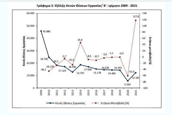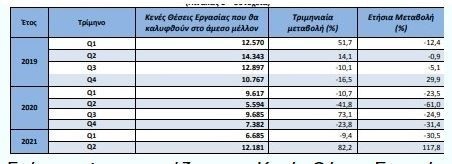 Ο αριθμός των Κενών Θέσεων Εργασίας κατά το Β΄ τρίμηνο 2021 παρουσιάζει αύξηση κατά 117,8% σε σύγκριση με το Β΄ τρίμηνο 2020 (12.181 και 5.594 αντίστοιχα), έναντι μείωσης 61,0% κατά την