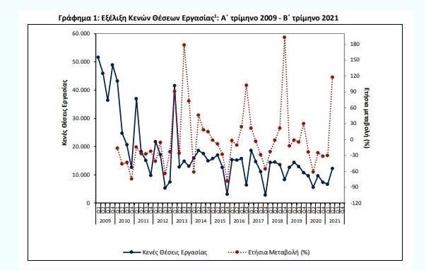 Μεγάλη αύξηση στις κενές θέσεις εργασίας για το β΄ εξάμηνο του 2021 ανακοίνωσε η Ελληνική Στατιστική Αρχή (ΕΛΣΤΑΤ) στο τριμηνιαίο Δελτίο Τύπου για τον αριθμό των Κενών Θέσεων Εργασίας στο σύνολο της οικονομίας, εκτός από τον Πρωτογενή Τομέα και τις Δραστηριότητες των Νοικοκυριών.