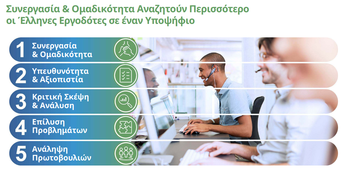 Τα στοιχεία που αναζητούν περισσότερο οι Εργοδότες στους Υποψηφίους είναι: Ομαδικότητα, Υπευθυνότητα και Αξιοπιστία, Κριτική Σκέψη και Ανάλυση, Επίλυση Προβλημάτων και Ανάληψη Πρωτοβουλιών.