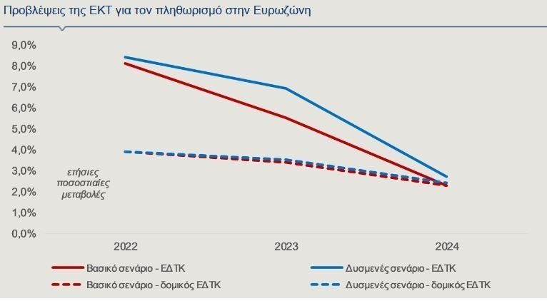 Συγκεκριμένα, σύμφωνα με το βασικό σενάριο της ΕΚΤ, ο πληθωρισμός αναμένεται να διαμορφωθεί, κατά μέσο όρο το 2022, στο υψηλό 8,1% και να αποκλιμακωθεί σταδιακά στο 5,5% το 2023 και στο 2,3% το 2024.