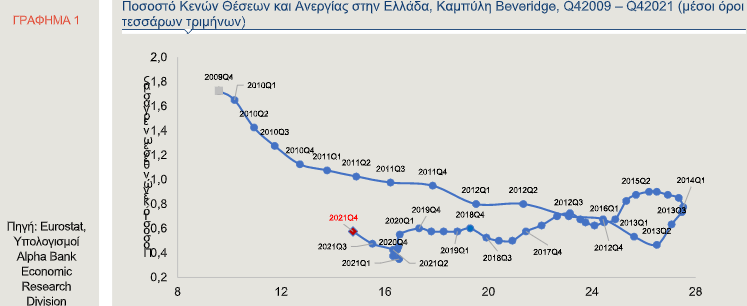 Στο Γράφημα 1 παρουσιάζεται η καμπύλη Beveridge για την ελληνική αγορά εργασίας, από το τέταρτο τρίμηνο του 2009, έως το τέταρτο τρίμηνο του 2021. Η καμπύλη αυτή αναπαριστά την (αναμενόμενη) αρνητική συσχέτιση μεταξύ (α) του ποσοστού κενών θέσεων εργασίας (σύμφωνα με τον ορισμό της Eurostat), το οποίο αποτελεί δείκτη ζήτησης εργασίας από τις επιχειρήσεις και (β) του ποσοστού της ανεργίας. Οι κινήσεις κατά μήκος της καμπύλης σχετίζονται με τις κυκλικές διακυμάνσεις της οικονομίας. Για παράδειγμα, κατά τη διάρκεια των υφέσεων, υπάρχουν συνήθως λίγες κενές θέσεις και υψηλή ανεργία, ενώ κατά τη διάρκεια της επεκτατικής φάσης του οικονομικού κύκλου προσφέρονται περισσότερες θέσεις εργασίας, με συνέπεια τη μείωση της ανεργίας.