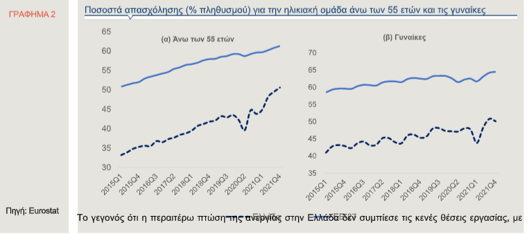 Σε ό,τι αφορά στους μεγαλύτερης ηλικίας εργαζόμενους, όπως παρατηρείται στο Γράφημα 2α, το ποσοστό απασχόλησης για τους άνω των 55 ετών, το οποίο είχε υποχωρήσει σημαντικά το δεύτερο τρίμηνο του 2020, έκτοτε αυξήθηκε φθάνοντας το 50,6% το τέταρτο τρίμηνο του 2021. Επιπρόσθετα αξίζει να σημειωθεί ότι το ποσοστό απασχόλησης των άνω των 55 ετών παρέμεινε την τελευταία εξαετία σε έντονα ανοδική τροχιά στην ΕΕ-27, σε αντίθεση με τις ΗΠΑ και το Ηνωμένο Βασίλειο, όπου, σύμφωνα με την Έκθεση του ΔΝΤ, το ποσοστό των ατόμων εκτός εργατικού δυναμικού που ανήκουν στην εν λόγω ηλικιακή ομάδα, είναι αυξημένο σε σύγκριση με την περίοδο προ της πανδημίας.