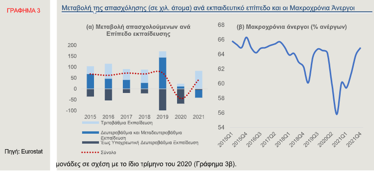 Το γεγονός ότι η περαιτέρω πτώση της ανεργίας στην Ελλάδα δεν συμπίεσε τις κενές θέσεις εργασίας, με το ποσοστό τους να παραμένει σε γενικές γραμμές σταθερό, στο 0,6%, από το 2017 και μετά, ερμηνεύεται σε σημαντικό βαθμό από την αναντιστοιχία μεταξύ των προσφερόμενων και ζητούμενων δεξιοτήτων στην αγορά εργασίας. Σημειώνεται ότι η άνοδος της απασχόλησης το 2021 στην Ελλάδα, όπως παρατηρείται στο Γράφημα 3α, αφορούσε αποφοίτους τριτοβάθμιας εκπαίδευσης, ενώ για τα άτομα που κατέχουν τίτλους έως και μεταδευτεροβάθμιας εκπαίδευσης, η απασχόληση μειώθηκε. Επιπρόσθετα, σύμφωνα με έκθεση της Cedefop (2020 Skills Forecast), εκτός από τους επαγγελματίες, οι θέσεις εργασίας που εκτιμάται ότι θα έχουν τη μεγαλύτερη ζήτηση στην Ελλάδα μέχρι το 2030, είναι στην παροχή υπηρεσιών και τις πωλήσεις, καθώς και στον αγροτικό τομέα. Καθοριστικό παράγοντα για την ορθή και αποτελεσματική αντιστοίχιση των δεξιοτήτων στην αγορά εργασίας, ώστε αφενός να ανταποκρίνονται στις ανάγκες της αγοράς (επαρκής κάλυψη της ζήτησης δεξιοτήτων) και αφετέρου να μην υπο-αξιοποιούνται (μείωση της ετεροαπασχόλησης και εύρεση εργασίας που να αξιοποιεί τα προσόντα), αποτελεί η ουσιαστική σύνδεση της εκπαίδευσης, κυρίως της τριτοβάθμιας, αλλά και της δευτεροβάθμιας τεχνικής και επαγγελματικής εκπαίδευσης, με την αγορά εργασίας. Επιπλέον, η ενίσχυση της τεχνικής επαγγελματικής εκπαίδευσης, σύμφωνα με τις ανάγκες της αγοράς, εκτιμάται ότι θα συμβάλλει ουσιαστικά στην πλήρωση των αντίστοιχων θέσεων εργασίας, οι οποίες βάσει της μελέτης της Cedefop αναμένεται ότι θα είναι σημαντικά αυξημένες μέχρι το 2030 (τεχνικοί και ασκούντες συναφή επαγγέλματα).