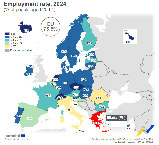 Ωστόσο, η Ελλάδα συγκαταλέγεται στις χώρες με τις χαμηλότερες επιδόσεις, καθώς το ποσοστό απασχόλησης διαμορφώθηκε σε 69,3%, τοποθετώντας τη στη προτελευταία θέση μεταξύ των κρατών-μελών. Χαμηλότερο ποσοστό καταγράφηκε μόνο στην Ιταλία (67,1%), ενώ η Ρουμανία βρέθηκε λίγο ψηλότερα με 69,5%.