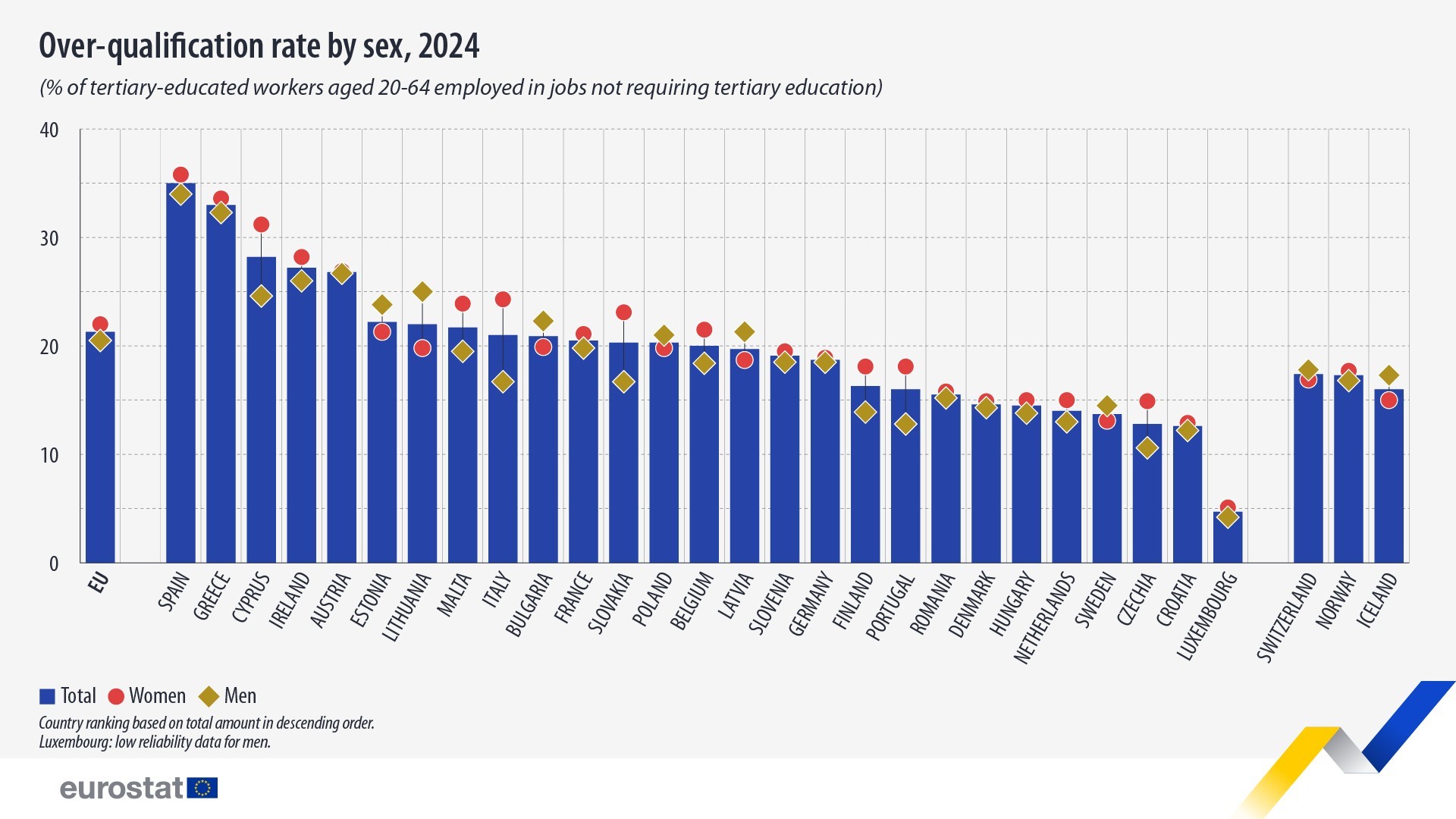 Σε επίπεδο ΕΕ, το συνολικό ποσοστό του «overqualification» ήταν 21,3%, με τις γυναίκες να εμφανίζουν υψηλότερο ποσοστό (22%) από τους άνδρες (20,5%).