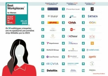 Τη Λίστα Best Workplaces™ for Women Hellas 2023 με τις εταιρείες που διακρίνονται ως οι καλύτεροι εργοδότες για τις γυναίκες, ανακοίνωσε τη Πέμπτη 30 Μαρτίου το Great Place to Work® Hellas, ανάμεσα σε αυτές που έχουν συμμετάσχει στην έρευνα του Great Place To Work® και έχουν πιστοποιηθεί για το καλό εργασιακό τους περιβάλλον από τον οργανισμό μέσα στο 2022.