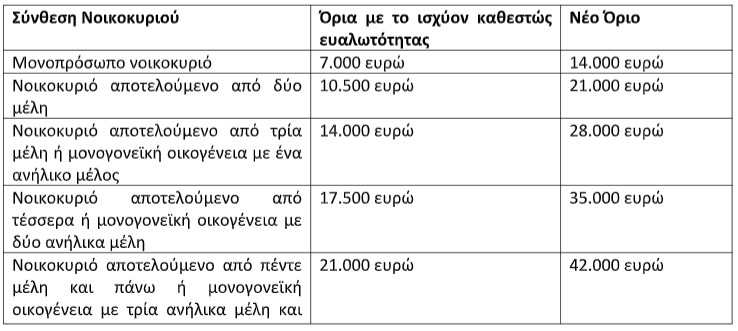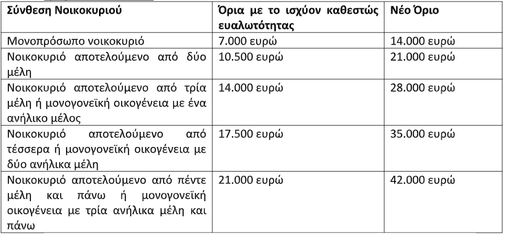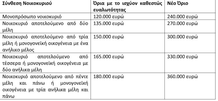 1) Διπλασιασμός των ορίων, εισοδηματικών και περιουσιακών, προκειμένου να χαρακτηριστεί ένας οφειλέτης επιλέξιμος στο πλαίσιο της υποχρεωτικής αποδοχής του εξωδικαστικού μηχανισμού από τους πιστωτές. Προϋπόθεση είναι ο οφειλέτης να έχει ανώτατο όριο ήδη μη εξυπηρετούμενων τραπεζικών οφειλών ( σε τράπεζες ή servicers) τις 300.000 ευρώ.
