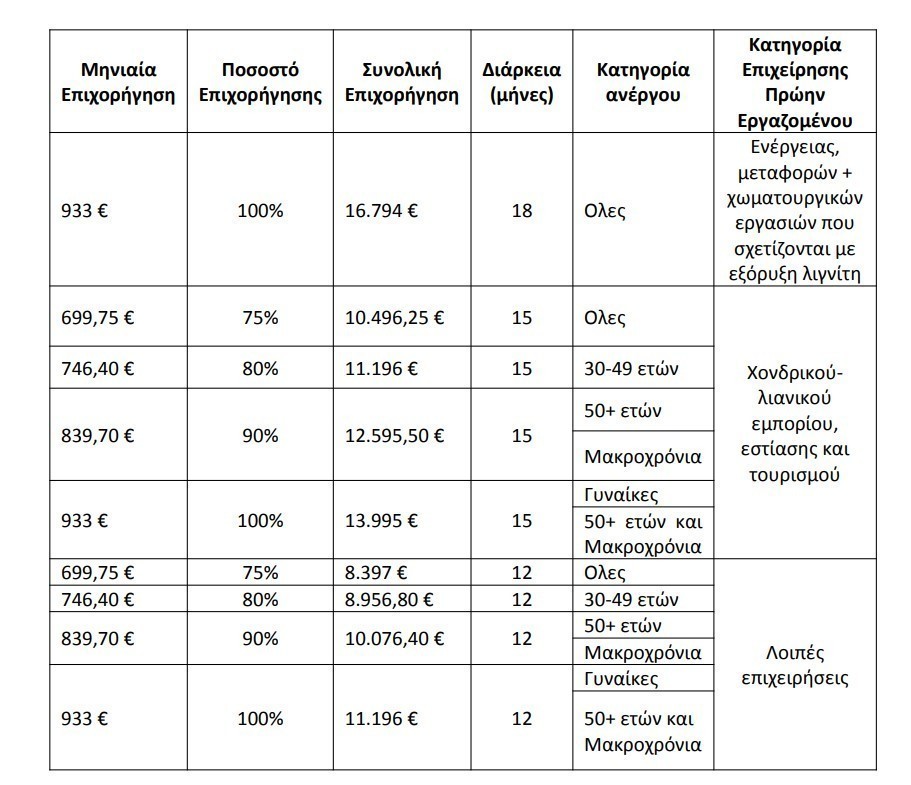 Η διάρκεια του προγράμματος είναι 12-18 μήνες, το ποσοστό επιχορήγησης μισθού και εισφορών κυμαίνεται μεταξύ 75-100%, ενώ το ποσό επιχορήγησης κυμαίνεται από 700 € έως 933 € μηνιαία και από 8.397 € έως 16.794 € συνολικά, ανάλογα με την κατηγορία του ανέργου και του κλάδου της επιχείρησης που εργαζόταν. Στην επιχορήγηση του μισθολογικού και μη μισθολογικού κόστους συμπεριλαμβάνονται δώρα εορτών και επίδομα αδείας.