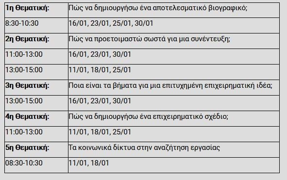 Σύμφωνα με την ανακοίνωση της Υπηρεσίας, όλοι όσοι αναζητούν εργασία και επιθυμούν να αναβαθμίσουν τις δεξιότητές τους στη διαχείριση της σταδιοδρομίας τους, μπορούν να παρακολουθήσουν e- εργαστήρια στις εξής θεματικές ενότητες: