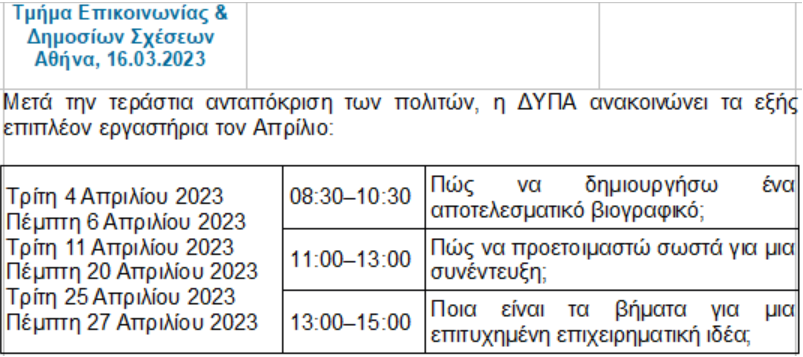 Όπως ανακοίνωσε η ΔΥΠΑ, μετά την τεράστια ανταπόκριση των πολιτών θα ακολουθήσουν επιπλέον εργαστήρια τον Απρίλιο.