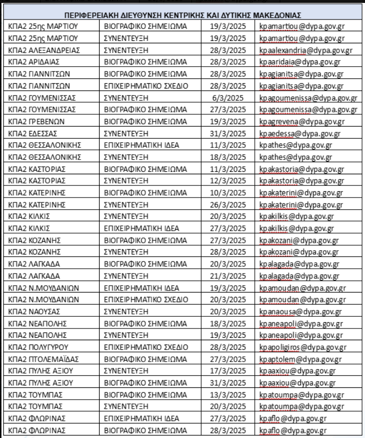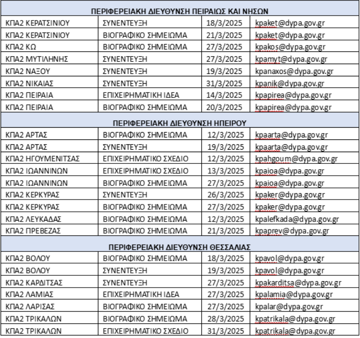 Οι ενδιαφερόμενοι εγγεγραμμένοι στο ψηφιακό μητρώο της ΔΥΠΑ μπορούν να δηλώσουν συμμετοχή ηλεκτρονικά, στέλνοντας email με τα στοιχεία επικοινωνίας τους στη διεύθυνση ηλεκτρονικού ταχυδρομείου του ΚΠΑ2 (δείτε πίνακα), το οποίο υλοποιεί το εργαστήριο που τους ενδιαφέρει.