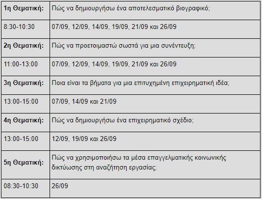 Όλοι όσοι αναζητούν εργασία και επιθυμούν να αναβαθμίσουν τις δεξιότητες τους στη διαχείριση της σταδιοδρομίας τους μπορούν να παρακολουθήσουν e-Εργαστήρια στις εξής θεματικές ενότητες: