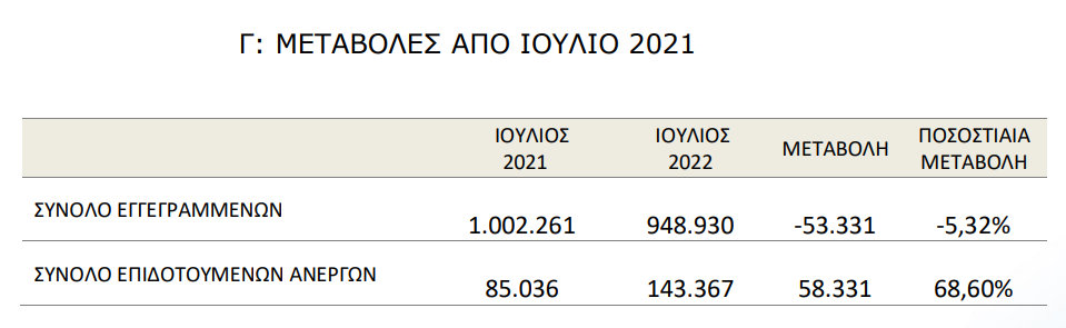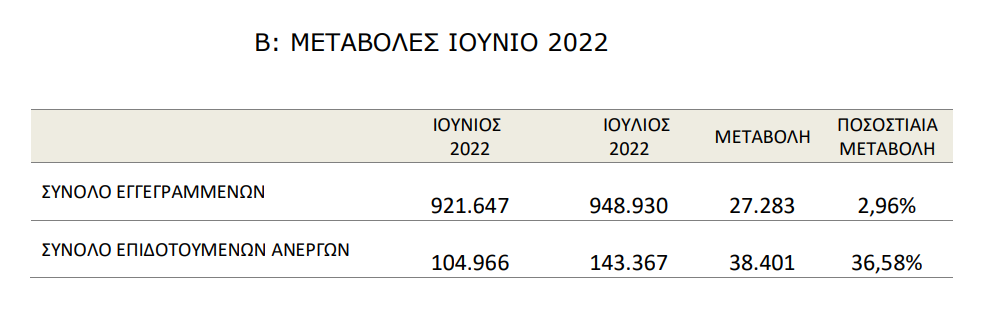 3. Το σύνολο των επιδοτούμενων ανέργων, για τον μήνα Ιούλιο 2022, (αφορά τον αριθμό των δικαιούχων που πληρώθηκαν εντός του αντίστοιχου μήνα) ανέρχεται σε 143.367 άτομα, από τα οποία οι 133.123 (ποσοστό 92,85%) είναι κοινοί και λοιπές κατηγορίες επιδοτουμένων και οι 10.244 (ποσοστό 7,15%) είναι εποχικοί τουριστικών επαγγελμάτων. Οι άνδρες ανέρχονται σε 51.511 (ποσοστό 35,93%) και οι γυναίκες σε 91.856 (ποσοστό 64,07%).
