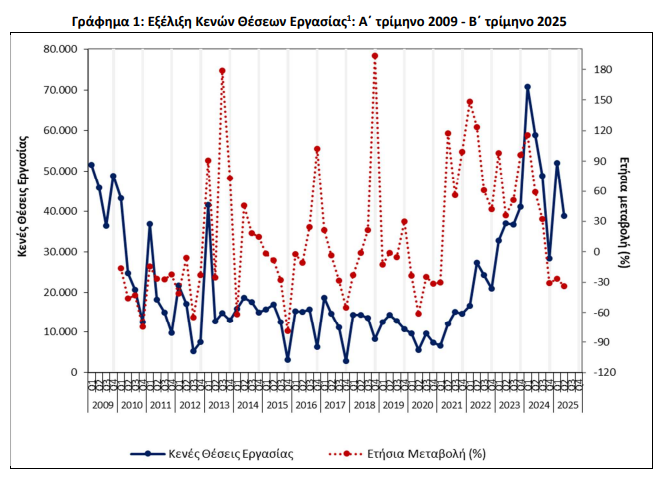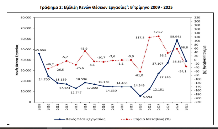 Μείωση 34,1% σημείωσε ο αριθμός των κενών θέσεων εργασίας στο σύνολο της οικονομίας, εξαιρουμένου του πρωτογενή τομέα και των δραστηριοτήτων των νοικοκυριών, το β’ τρίμηνο φέτος σε σύγκριση με το β’ τρίμηνο του 2024 (38.834 και 58.941 θέσεις αντίστοιχα), έναντι αύξησης 58,8% που υπήρξε κατά την αντίστοιχη σύγκριση του β’ τριμήνου του 2024 προς το β’ τρίμηνο του 2023.