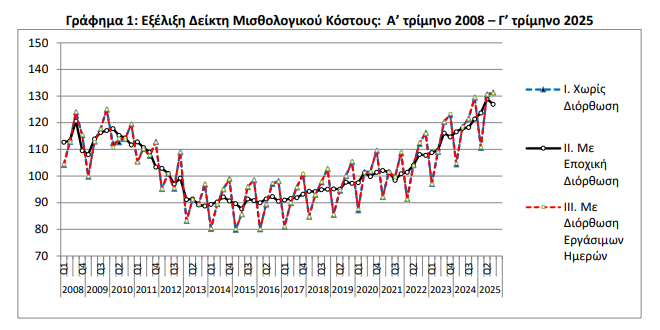 Αύξηση 8,1% παρουσίασε ο δείκτης μισθολογικού κόστους στο σύνολο της οικονομίας, εξαιρουμένου του πρωτογενή τομέα και των δραστηριοτήτων των νοικοκυριών, το γ’ τρίμηνο φέτος, χωρίς καμία διόρθωση (εποχική ή διόρθωση ως προς τον αριθμό των εργάσιμων ημερών), σε σύγκριση με τον αντίστοιχο δείκτη του γ’ τριμήνου 2024, έναντι αύξησης 1% κατά την αντίστοιχη σύγκριση του γ’ τριμήνου 2024 προς το γ’ τρίμηνο του 2023.
