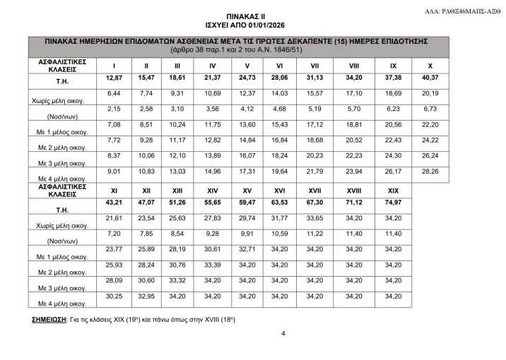 Στους παρακάτω πίνακες παρατίθενται αναλυτικά τα ημερήσια ποσά επιδόματος ασθένειας και μητρότητας:
