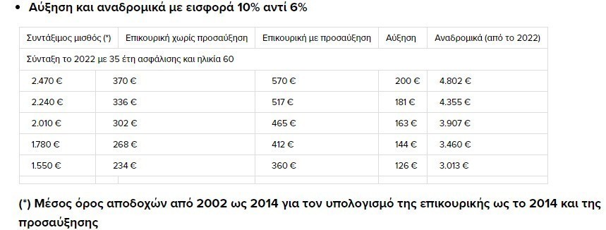- Συνταξιούχος με επιπλέον εισφορά επικουρικής 4% (σύνολο 10%) που αποχώρησε το 2022 με 35 έτη σε ηλικία 60 ετών παίρνει επικουρική 370 ευρώ. Δικαιούται προσαύξηση 200 ευρώ με αναδρομικά 4.802 ευρώ για 27 χρόνια αυξημένων εισφορών. Μετά την αύξηση η επικουρική του σύνταξη θα ανέλθει στα 570 ευρώ.