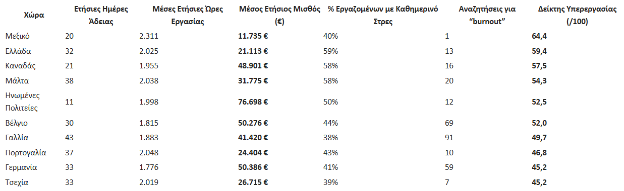 Η Ελλάδα ακολουθεί με 32 ημέρες άδειας και 2.025 ώρες εργασίας τον χρόνο, ωστόσο εμφανίζει το υψηλότερο ποσοστό burnout μεταξύ των πέντε πρώτων χωρών: 59% των εργαζομένων δηλώνουν ότι βιώνουν καθημερινό στρες ή εξουθένωση. Με μέσο μισθό περίπου 21.000 ευρώ, οι Έλληνες εργαζόμενοι βρίσκονται ανάμεσα στην έντονη συναισθηματική πίεση και τις σχετικά χαμηλές αποδοχές. Η εικόνα αυτή αναδεικνύει τις συνεχιζόμενες προκλήσεις της ελληνικής αγοράς εργασίας και την ανάγκη για ουσιαστικές πολιτικές ισορροπίας ζωής–εργασίας.