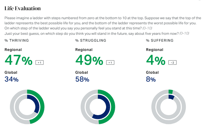 Πάντως, αναφορικά με το πως αξιολογούν τη ζωή τους γενικότερα, το 47% των Ευρωπαίων ανέφερε ότι ευημερεί, τη στιγμή που ο παγκόσμιος μέσος όρος διαμορφώνεται στο 34%, το 49% είπε ότι δυσκολεύεται (58% παγκοσμίως) και μόλις το 4% ότι υποφέρει (8%).
