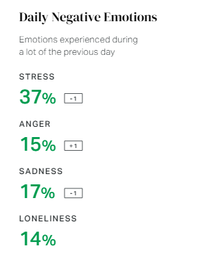 Σε επίπεδο αρνητικών συναισθημάτων οι εργαζόμενοι στην Ευρώπη, νιώθουν καθημερινά άγχος σε επίπεδο 37%, θυμό (το 15%), λύπη (17%) και μοναξιά (14%). Όλα τα ποσοστά είναι χαμηλότερα από το παγκόσμιο επίπεδο.