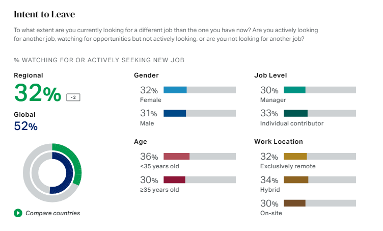 Τέλος το 57% των Ευρωπαίων θεωρεί πως είναι καλή περίοδος να βρει μία νέα δουλειά στην ήπειρο, αν και μόνο το 1/3 αυτών (32%) ψάχνει ενεργά τρόπο να αλλάξει θέση, σε σύγκριση με τον παγκόσμιο μέσο όρο που διαμορφώνεται στο 52%.