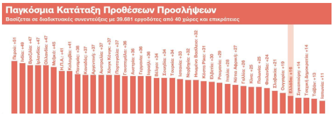 Με βάση την εποχικά προσαρμοσμένη ανάλυση*, οι 39.681 εργοδότες στις 40 χώρες και επικράτειες που συμμετείχαν στην έρευνα, προσδοκούν σε αύξηση του αριθμού απασχολουμένων κατά το προσεχές τρίμηνο. Τα ισχυρότερα σχέδια προσλήψεων για το προσεχές τρίμηνο καταγράφονται σε Περού, Ινδία, Βραζιλία, Ιρλανδία και Ολλανδία. Οι πιο αδύναμες προθέσεις προσλήψεων καταγράφονται σε Ιαπωνία, Ταϊβάν, Σιγκαπούρη και Τσέχικη Δημοκρατία.