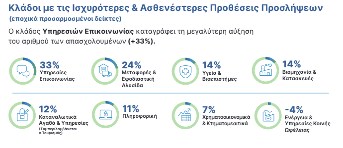 Ο κ. Χαράλαμπος Καζαντζίδης, διευθύνων σύμβουλος της ManpowerGroup Ελλάδας δήλωσε: «Οι προσδοκίες για τις προσλήψεις στην Ελλάδα παραμένουν συγκρατημένες ενώ παράλληλα αναδύονται νέες προκλήσεις αναφορικά με την ανάγκη υιοθέτησης μιας νοοτροπίας προσανατολισμένης στη Βιωσιμότητα, που θα διασφαλίζει κοινωνικά υπεύθυνες πρακτικές στις στρατηγικές διαχείρισης του δυναμικού αλλά και ποιοτικές και καλά αμειβόμενες θέσεις εργασίας. Η ‘πρωτοκαθεδρία’ του κλάδου των Υπηρεσιών Επικοινωνίας (+33%) στην κατάταξη των επαγγελμάτων με τα περισσότερο ζητούμενα ταλέντα εξηγείται από μια σειρά παραμέτρους, όπως η ανάγκη για αποτελεσματική επικοινωνία που δημιουργεί η παγκοσμιοποίηση, ο ψηφιακός μετασχηματισμός και η ανάδυση νέων digital καναλιών, η ισχυροποίηση του τομέα Εξυπηρέτησης πελατών. Αντίστοιχα υψηλές προθέσεις προσλήψεων (+24%) σημειώνει και ο κλάδος των Μεταφορών & Logistics κυρίως λόγω της γεωγραφικής θέσης της Ελλάδας που την καθιστά μια στρατηγική πύλη εισόδου μεταξύ Ευρώπης, Ασίας και Αφρικής. Ωστόσο σημαντικό ρόλο διαδραματίζει και η άνθηση της Τουριστικής βιομηχανίας, η έκρηξη στο Ηλεκτρονικό Εμπόριο, η δρομολόγηση νέων έργων για Υποδομές και η ανάπτυξη δικτύων Τηλεπικοινωνιών και Ενέργειας.