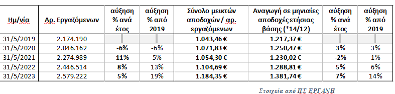 Κατά συνέπεια, όπως επισημαίνει το υπουργείο Εργασίας και Κοινωνικών Υποθέσεων σε ανακοίνωσή του, παρατηρείται σήμερα, σε σχέση ακόμα και με τα προ πανδημίας επίπεδα, αφενός μεν μία σημαντική αύξηση των εργαζομένων με μισθωτή εξαρτημένη εργασία κατά 405.032 εργαζόμενους αφετέρου δε μία σημαντική αύξηση των μέσων μηνιαίων αποδοχών κατά ποσοστό 14%.