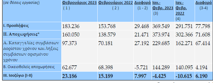 Συγκεκριμένα, τον Φεβρουάριο οι αναγγελίες προσλήψεων ανήλθαν στις 183.236 και οι αποχωρήσεις έφτασαν τις 160.050 (97.373 καταγγελίες συμβάσεων αορίστου χρόνου ή λήξεις συμβάσεων ορισμένου χρόνου και 62.677 οικειοθελείς αποχωρήσεις).