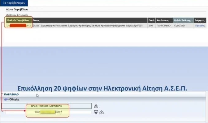 Αντιγράψτε (copy) και επικολλήστε (paste) τα είκοσι (20) ψηφία του ηλεκτρονικού παραβόλου χωρίς κενά στο πεδίο της ηλεκτρονικής αίτησης του ΑΣΕΠ: «Ηλεκτρονικό Παράβολο»