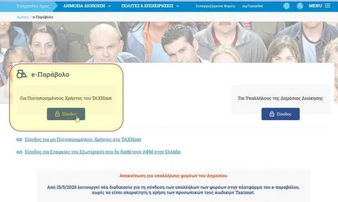Επιλέξτε «Είσοδος» στην κατηγορία «Για Πιστοποιημένους Χρήστες του TAXISnet»