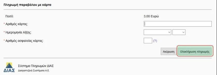 Πληκτρολογήστε τα στοιχεία της χρεωστικής ή της πιστωτικής κάρτας και πατήστε: «Ολοκλήρωση πληρωμής»