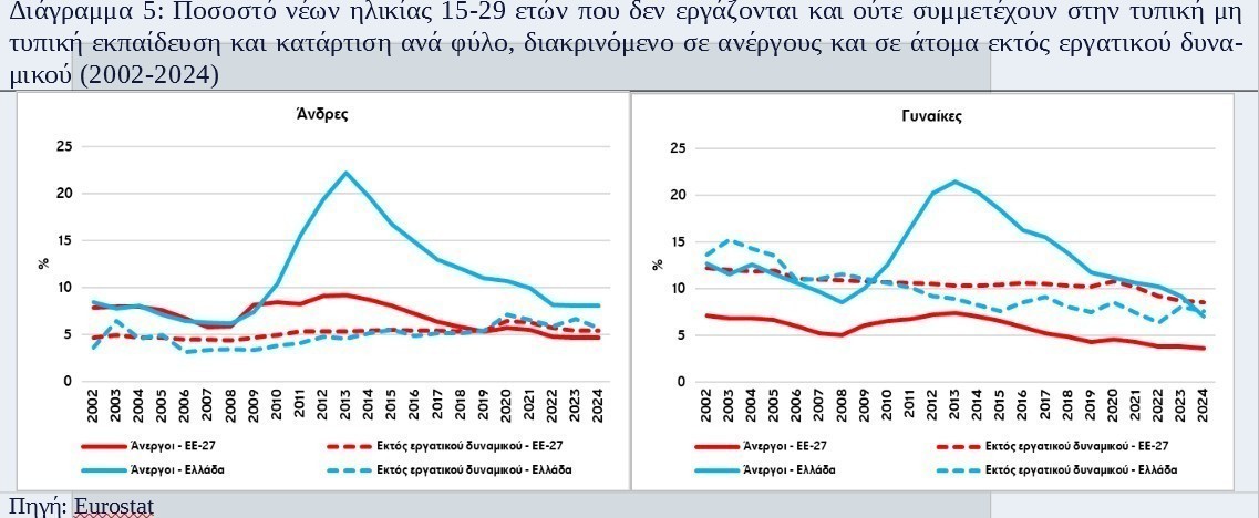 Η έρευνα αναδεικνύει και την κοινωνική διάσταση του ζητήματος. Παραδοσιακά, οι γυναίκες παρουσίαζαν πολύ υψηλότερα ποσοστά αδράνειας, εν μέρει λόγω κοινωνικών στερεοτύπων. Αν και η ψαλίδα με τους άνδρες έχει κλείσει εντυπωσιακά (μόλις 0,9 ποσοστιαίες μονάδες διαφορά το 2024), οι γυναίκες εξακολουθούν να αποτελούν την πλειονότητα όσων βρίσκονται «εκτός εργατικού δυναμικού» – δηλαδή ατόμων που δεν αναζητούν καν εργασία.