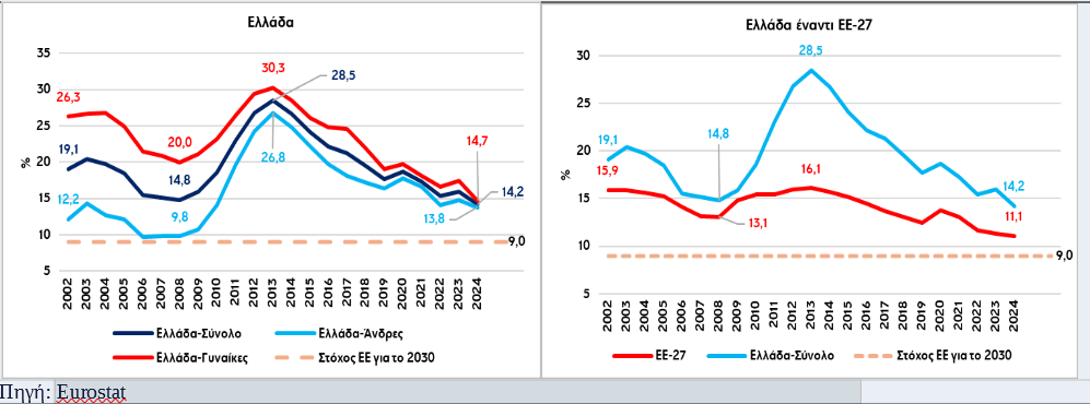 Σήμερα, η κατάσταση είναι σαφώς βελτιωμένη. Το 2024 το ποσοστό αυτό υποχώρησε στο 14,2%, επίπεδο χαμηλότερο ακόμα και από το ξεκίνημα της δεκαετίας του 2000. Ωστόσο, η Ελλάδα παραμένει η τέταρτη χειρότερη χώρα στην Ευρωπαϊκή Ένωση, απέχοντας σημαντικά από τον ευρωπαϊκό στόχο του 9% για το 2030.