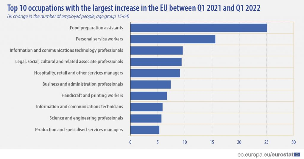 Το επάγγελμα του βοηθού προετοιμασίας τροφίμων, με άνοδο 25,1% ήταν αυτό που σημείωσε τη μεγαλύτερη ποσοστιαία αύξηση στον αριθμό των απασχολουμένων στην ΕΕ, μεταξύ του 1ου τριμήνου 2021 και 1ου τριμήνου 2022. Το εν λόγω επάγγελμα κατέγραψε άλμα και από σχεδόν 1,1 εκατ. εργαζόμενους έφτασε σε 1,4 εκατομμύρια.