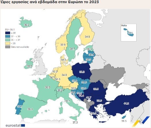Ο μέσος εργαζόμενος της Ευρωπαϊκής Ένωσης εργάζεται περίπου 36,1 ώρες την εβδομάδα στην κύρια δουλειά του, σημαντικά λιγότερες από τον μέσο Έλληνα.