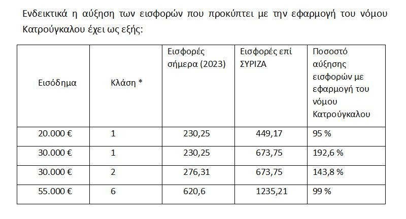 «Έως και τριπλάσιες ασφαλιστικές εισφορές, σε σύγκριση με το σημερινό καθεστώς, θα πληρώνουν οι ελεύθεροι επαγγελματίες σε περίπτωση επαναφοράς του νόμου Κατρούγκαλου, την οποία ανήγγειλε με δηλώσεις του ο πρώην υπουργός Εργασίας του ΣΥΡΙΖΑ, Γιώργος Κατρούγκαλος», σύμφωνα με ανακοίνωση του υπουργείου Εργασίας και Κοινωνικών Υποθέσεων.