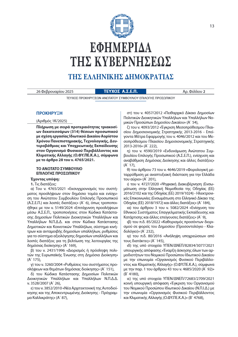 Πιο συγκεκριμένα, με την υπ’ αριθμ. 1Κ/2025 (ΦΕΚ ΤΕΥΧΟΣ ΑΣΕΠ 2/26-02-2025) προκήρυξη προβλέπονται προσλήψεις προσωπικού ως εξής: