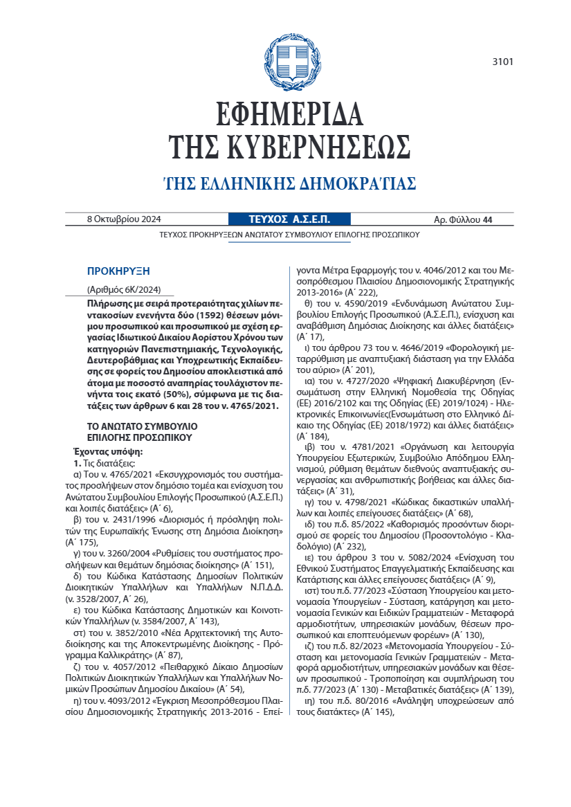 Έχει προηγηθεί η υπ’ αριθμ. 6Κ/2024 προκήρυξη, η οποία δημοσιεύτηκε σε ΦΕΚ στις 8/10/2024 και αφορούσε στην πρόσληψη προσωπικού αποκλειστικά από άτομα με ποσοστό αναπηρίας τουλάχιστον 50%, σύμφωνα με τις διατάξεις των άρθρων 6 και 28 του ν. 4765/2021.