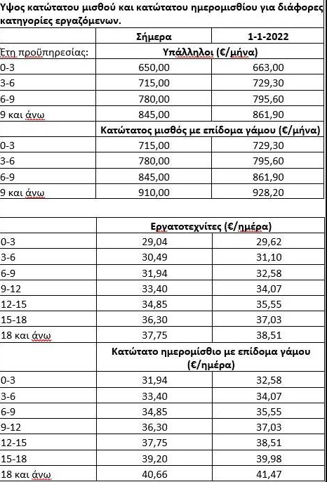 Έτσι, από την 1η Ιανουαρίου ο κατώτατος μεικτός μισθός διαμορφώνεται στα 663 ευρώ το μήνα επί 14 μισθούς συμπεριλαμβανομένων του Δώρου Χριστουγέννων, Πάσχα και του επιδόματος αδείας, ενώ με τις τριετίες φθάνει έως και 198,9 ευρώ υψηλότερα. Το κατώτατο ημερομίσθιο από 1-1-2022 διαμορφώνεται σε 29,62 ευρώ.