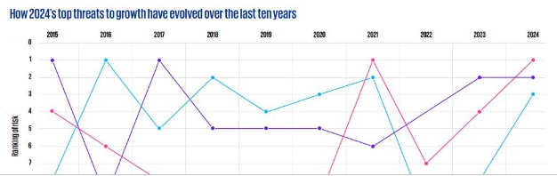 Τα ζητήματα που προβλημάτισαν τους CEO την τελευταία δεκαετία έχουν να κάνουν με το ρόλο τους στην ενίσχυση της εμπιστοσύνης και την προώθηση της ανάπτυξης για όλα τα ενδιαφερόμενα μέρη, ενώ ταυτόχρονα καλούνται να αντιμετωπίσουν μια σειρά από κινδύνους, από τους γεωπολιτικούς κινδύνους και τα προβλήματα της εφοδιαστικής αλυσίδας έως την κυβερνοασφάλεια, τον πληθωρισμό και τις ταχύτατες τεχνολογικές αλλαγές.