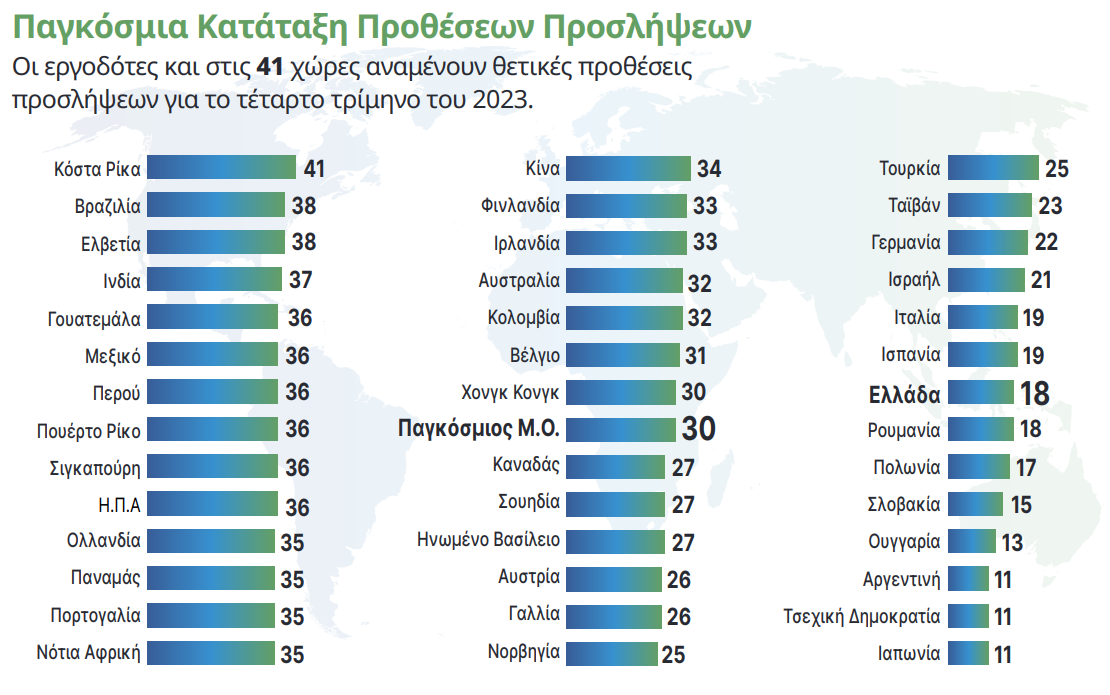 Με σταθερές προοπτικές σε όλες τις περιοχές, οι εργοδότες στη Βόρεια Αμερική αναμένουν τις ισχυρότερες προθέσεις προσλήψεων (+35%), ενώ ακολουθεί η Ασία-Ειρηνικός (+32%) και η Νότια και Κεντρική Αμερική (+31%. Στην επικράτεια ΕΜΕΑ, οι προοπτικές απασχόλησης παραμένουν χαμηλές αλλά σταθερές (+25%), με αύξηση +3% από το προηγούμενο τρίμηνο.