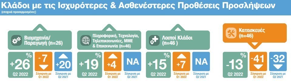 Όσοι αναζητούν εργασία στην Ελλάδα να αναμένουν μείωση των προθέσεων προσλήψεων για τους εννέα (9) από τους έντεκα (11) τομείς, σε σύγκριση με το τελευταίο τρίμηνο. Η Βιομηχανία/Παραγωγή είναι ο τομέας με τις καλύτερες επιδόσεις με τους υπεύθυνους προσλήψεων να καταγράφουν Συνολικές Προοπτικές Απασχόλησης στο +26%. Σε σύγκριση με το προηγούμενο τρίμηνο, εκείνοι που αναζητούν απασχόληση στον τομέα αυτό να περιμένουν μείωση των Συνολικών Προοπτικών Απασχόλησης κατά επτά (7) ποσοστιαίες μονάδες και αύξηση κατά είκοσι (20) μονάδες συγκριτικά με το 2ο τρίμηνο του 2021. Για το 2ο τρίμηνο του 2022 η πιο αδύναμη αγορά αναμένεται αυτή του τομέα των Κατασκευών, με τους υπεύθυνους προσλήψεων να καταγράφουν Συνολικές Προοπτικές Απασχόλησης στο -13%. Σε αυτό τον τομέα αναμένεται μείωση των προθέσεων προσλήψεων κατά ένα μεγάλο ποσοστό (-41%) σε σύγκριση με το προηγούμενο τρίμηνο.