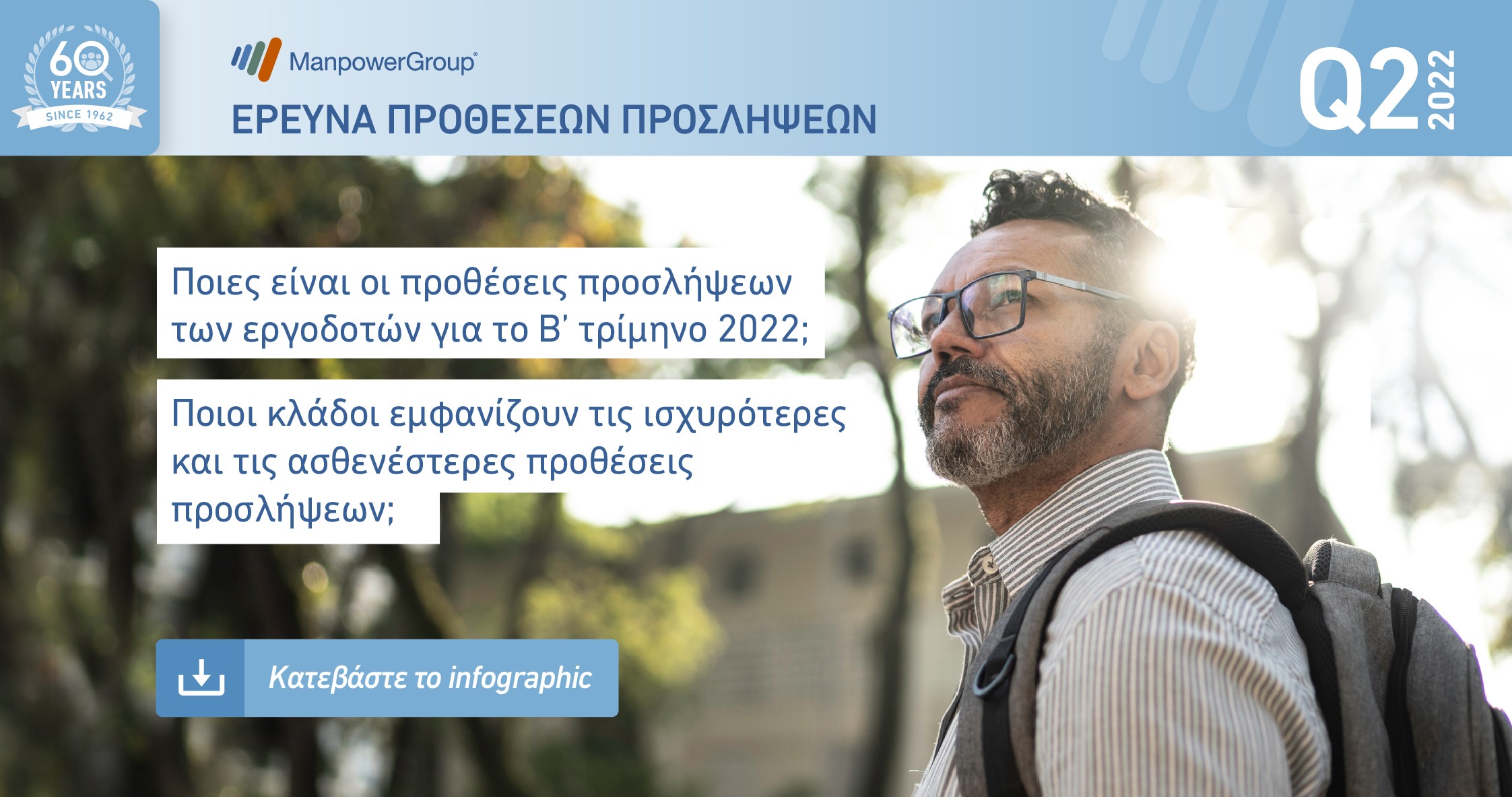 Η επόμενη Έρευνα για τις Προοπτικές Απασχόλησης της ManpowerGroup θα δημοσιευθεί στις 14 Ιουνίου 2022, με πληροφορίες για τις προσδοκίες προσλήψεων για το 3ο τρίμηνο του 2022.