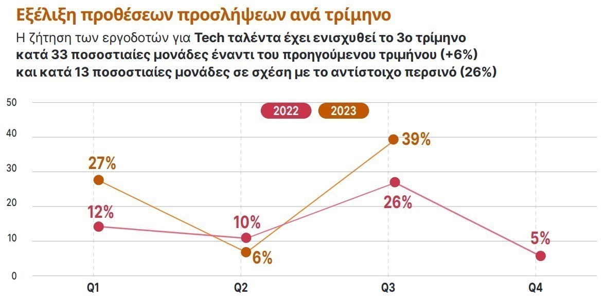 Στο πλαίσιο της τριμηνιαίας καθιερωμένης Έρευνας Προθέσεων Προσλήψεων του ομίλου ManpowerGroup προστίθενται νέα στοιχεία για τις Προθέσεις Προσλήψεων Αναζήτησης Ταλέντων Πληροφορικής. Σύμφωνα με την έρευνα οι προθέσεις προσλήψεων για τον κλάδο της Πληροφορικής διαμορφώνονται στο +39% για το 3ο τρίμηνο στην Ελλάδα. Συγκεκριμένα το 48% των εργοδοτών στον συγκεκριμένο κλάδο σχεδιάζει να προχωρήσει σε προσλήψεις. Μόλις το 9% προβλέπει μείωση, το 42% δεν αναμένει κάποια αλλαγή και ένα ανεπαίσθητο ποσοστό (1%) δεν γνωρίζει τι θα κάνει.