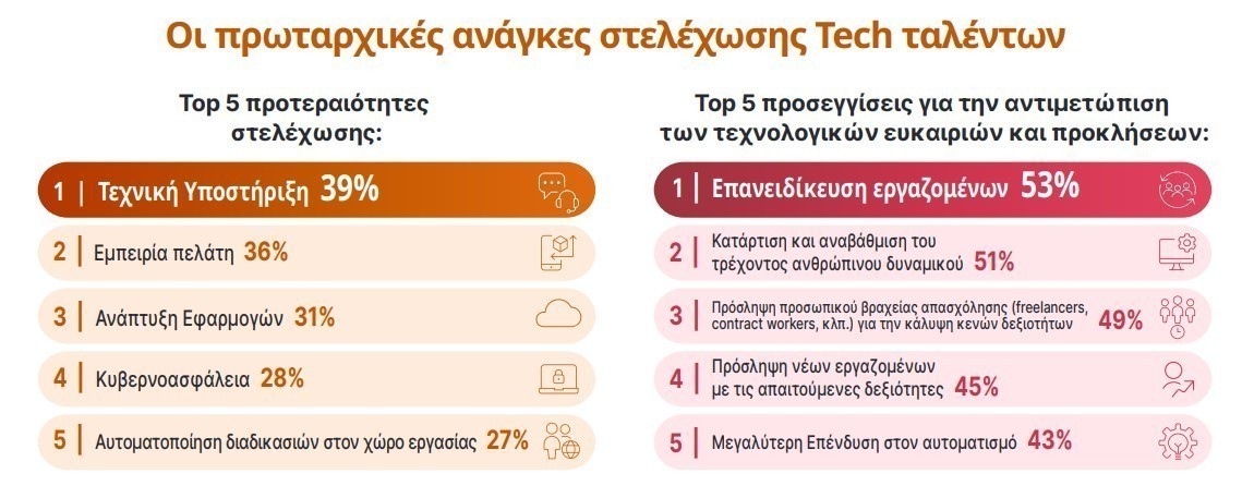 Είναι προφανές ότι οι εργαζόμενοι στον κλάδο της Πληροφορικής χρειάζονται αναβάθμιση δεξιοτήτων: Το 28% των Ελλήνων εργοδοτών θα προχωρούσε σε αναβάθμιση των τεχνικών δεξιοτήτων, το 32% σε αναβάθμιση της εταιρικής κουλτούρας και το 29% σε soft skills (επικοινωνία, ηγεσία, περιέργεια, συνεργασία, δημιουργικότητα).