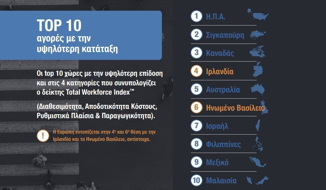 Πιο συγκεκριμένα, η 9η ετήσια έκθεση TWI του ομίλου ManpowerGroup αναλύει σε 69 παγκόσμιες αγορές περισσότερους από 200 παράγοντες για την αξιολόγηση της διαθεσιμότητας δεξιοτήτων, της αποδοτικότητας κόστους, των ρυθμιστικών πλαισίων και της παραγωγικότητας.