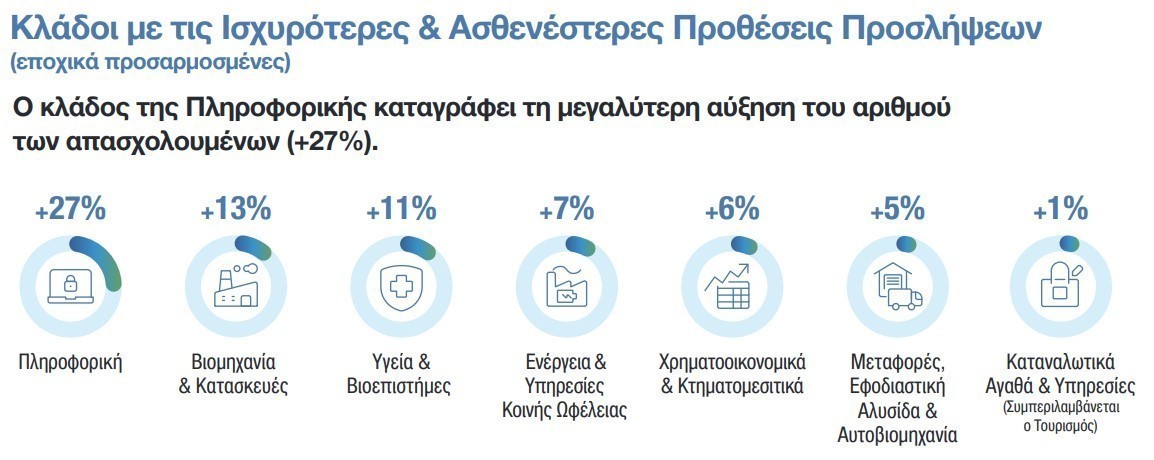 Ο πιο ανταγωνιστικός/ισχυρός τομέας στην Ελλάδα είναι η Πληροφορική με τις προοπτικές απασχόλησης να φθάνουν στο 27% σημειώνοντας αύξηση κατά 22% από το αμέσως προηγούμενο τρίμηνο και κατά 15% από το α΄ τρίμηνο του 2022. Ακολουθούν η Βιομηχανία και οι Κατασκευές με προοπτικές απασχόλησης 13%, αυξημένες κατά 29% έναντι του αμέσως προηγούμενου τριμήνου και μειωμένες κατά 6% έναντι του α΄ τριμήνου του 2022.